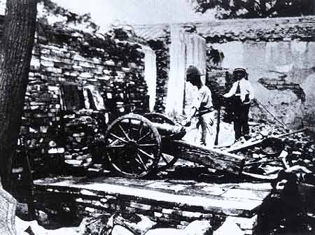 Legation guards resisted the attacking boxers and government forces at the entrance into the lane of Dongjiaominxiang.